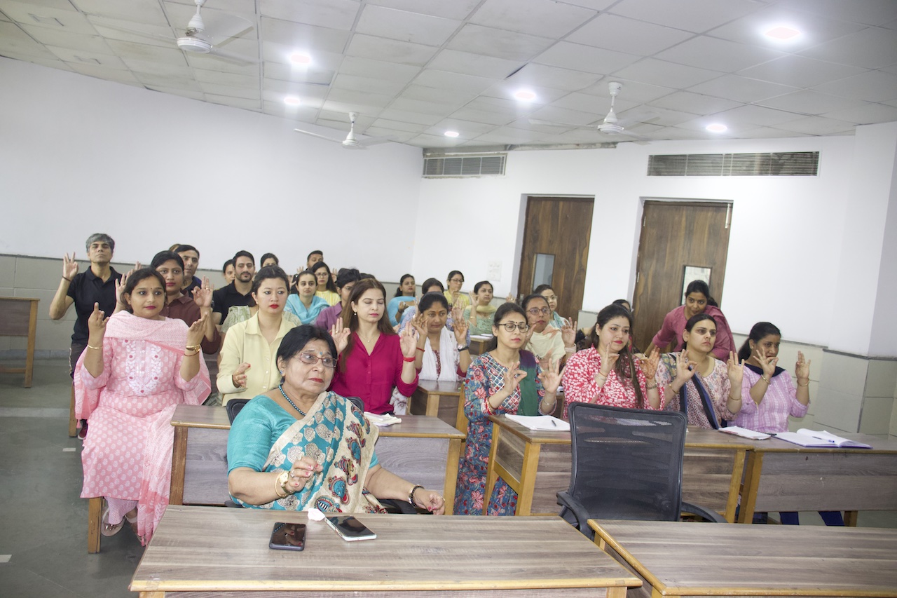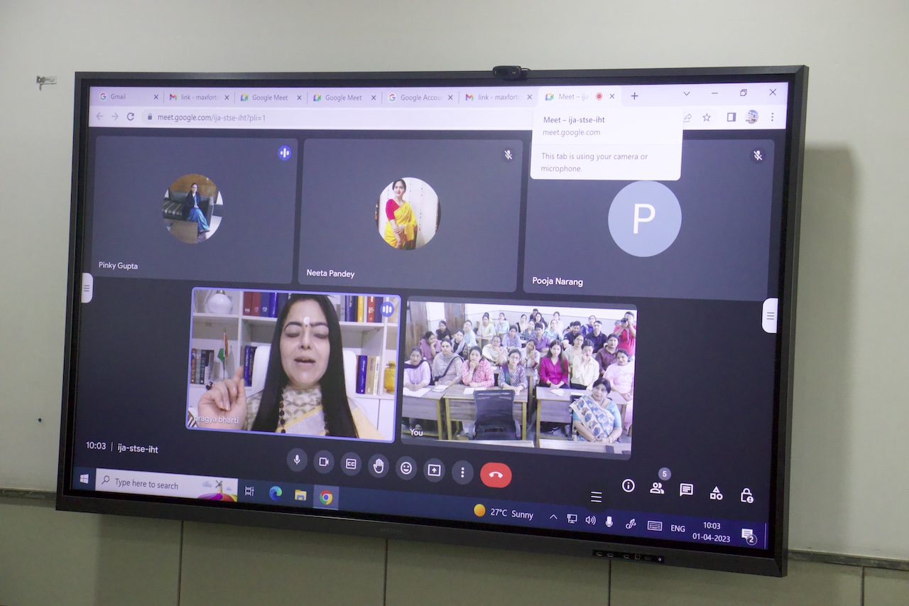 Later, honourable principal, Dr. Ratna Chakravarty organised an online rejuvenation session for the facilitators. The resource person was Sadhvi Pragya Bharti ji, a prolific speaker, a life coach, a spiritual teacher, and a holistic wellness expert. The theme of the session was “How to establish harmony between body, mind, and soul”. The highly motivational session started with Om chanting and Namaskara. Sadhvi ji efficiently explained the dimensions of body, mind, and soul to the participants. Physiological, psychological, and spiritual levels should be aligned for a peaceful life. It is very important to applaud yourself, and we should promote self-love. Continuous interactions were done with the participant-teachers to keep the essence of liveliness. At the end, the facilitators were told about five pivotal mudras (i.e., gyan mudra, vayu mudra, dhyana mudra, agni mudra, and varun mudra) to practise for around 20 minutes every day. The golden age ended with a few golden tips like practising gratitude, spending time with nature, connecting with something greater, and being compassionate to yourself and others to live a happy and joyful life.